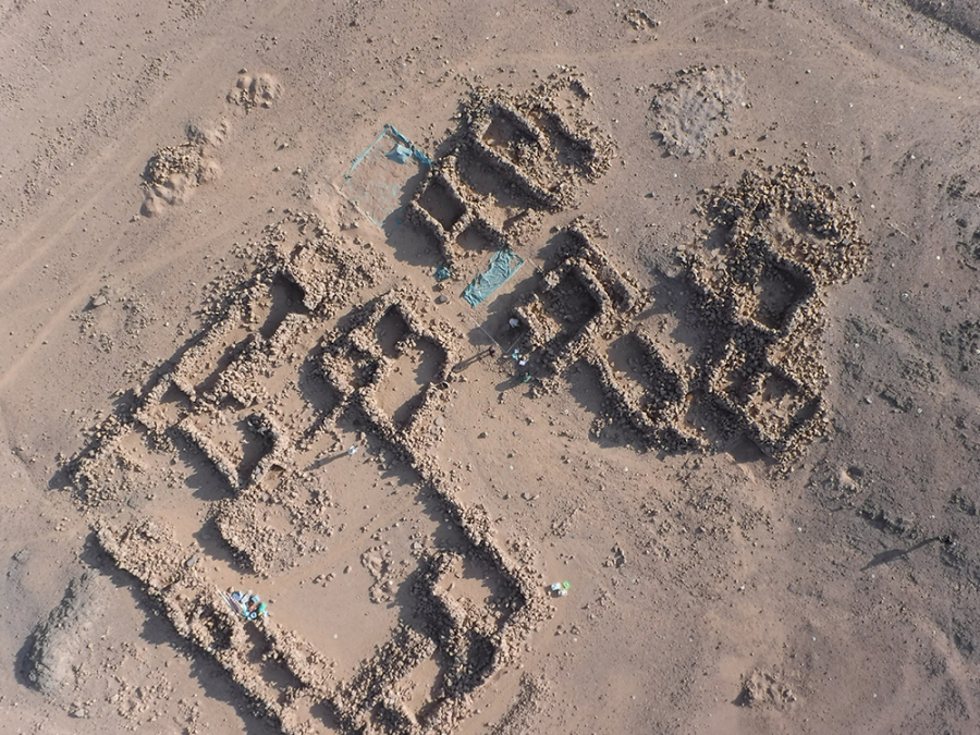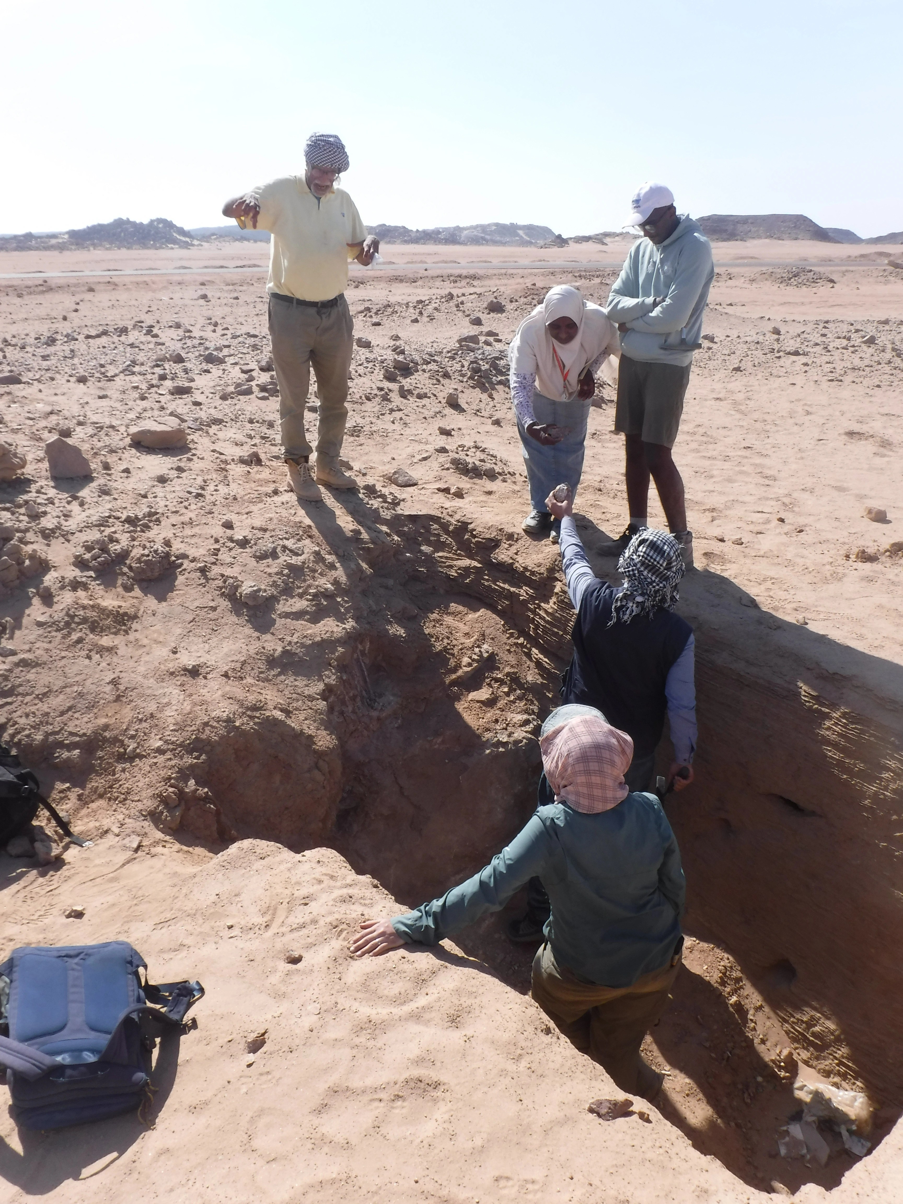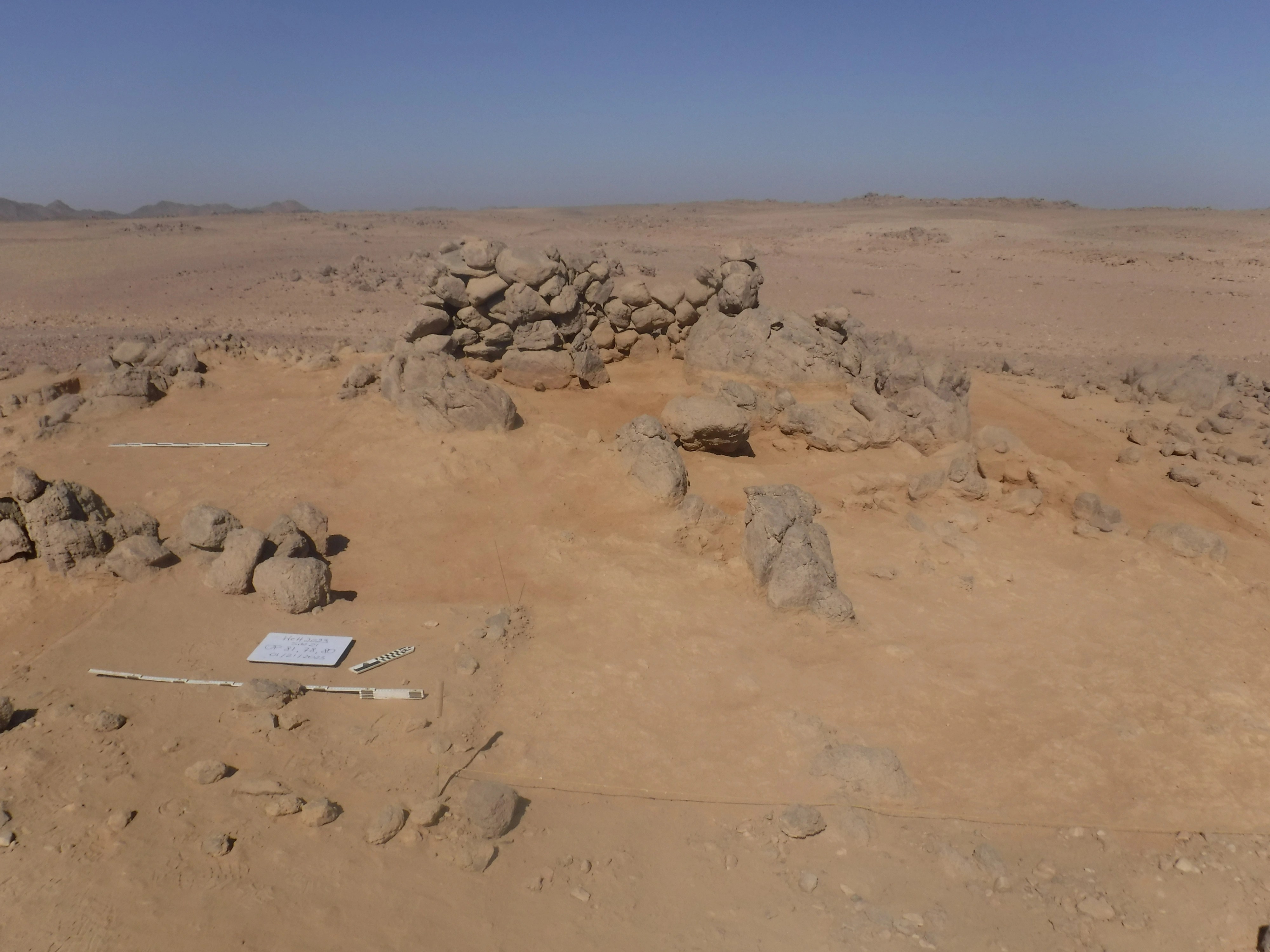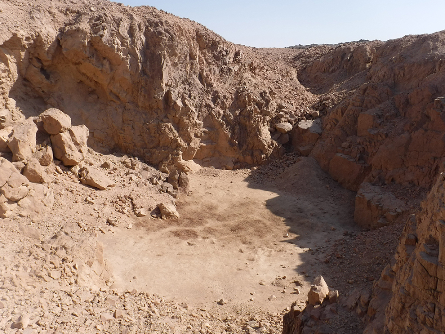 كان فريق أحمد فخري أول من قام بتحديد الموقع 8 في عام 1952 [i]، ثم قام كلٌ من إيان شو وروبرت جيمسون بزيارة الموقع مرة أخرى لفترة قصيرة في عام 1992 [ii]. هذا الموقع هو الأقرب إلى أسوان ويقع على سهل رملي بين تلال جرانيتية. عرّف فخري الموقع 8 في الأصل باعتباره موقعًا لبئر على الأرجح، ولكن بعد دراسة السطح وإجراء أعمال التنقيب في الموقع، فإننا نختلف مع هذا التعريف. حُفرت في العصور القديمة ثلاث حفرات متوسطة الحجم في هذه المنطقة، نعتقد أنها كانت لمحاجر وليس لآبار. تُشكّل المخلفات الناتجة عن هذه الحفرات تلًا كبيرًا في وسط الموقع، شُيدت بعد ذلك حوالي 10 أكواخ كبيرة على جوانب هذا التل. يضم الموقع آثارًا من عصر الدولة الوسطى والعصر البطلمي والعصر الروماني، بما في ذلك لوحة بقمة مستديرة وقاعدة خالية من النقوش من عصر الدولة الوسطى. حُفر خندق اختبار أولي للتنقيب في واحدة من هذه الحفرات في عام 2021. كشف هذا عن مستويات أفقية ضيقة جدًا من الرمال ناتجة عن سقوط الأمطار لآلاف السنين. ووفقًا لرأي الجيولوجي د. محمد حمدان من جامعة القاهرة [iii]، لم تكن هذه الحفرة بئرًا في يوم من الأيام وذلك نظرًا لاستواء التصدعات الأفقية؛ ولو كانت بئرًا، فإن تحرك المياه في القاع كان سيُحدث تموجات في هذه المستويات. بالإضافة إلى ذلك عثرت البعثة على قطع من حجر الكوارتز الحليبي. كما لم توجد أدلة تدعم وجود بئر هنا؛ فلا يوجد سلم أو مقابض للوصول إلى قاع البئر ولا يوجد أثر لأواني مياه مكسورة. وهكذا يستمر سعينا للعثور على أي مصادر قديمة للمياه في وادي الهودي، ولكن حتى الآن فإن الرأي الأكثر ترجيحًا هو أن قوافل الإمدادات المتواصلة كانت ضرورية لجلب الطعام والمياه من وادي النيل إلى بعثات التعدين هنا.