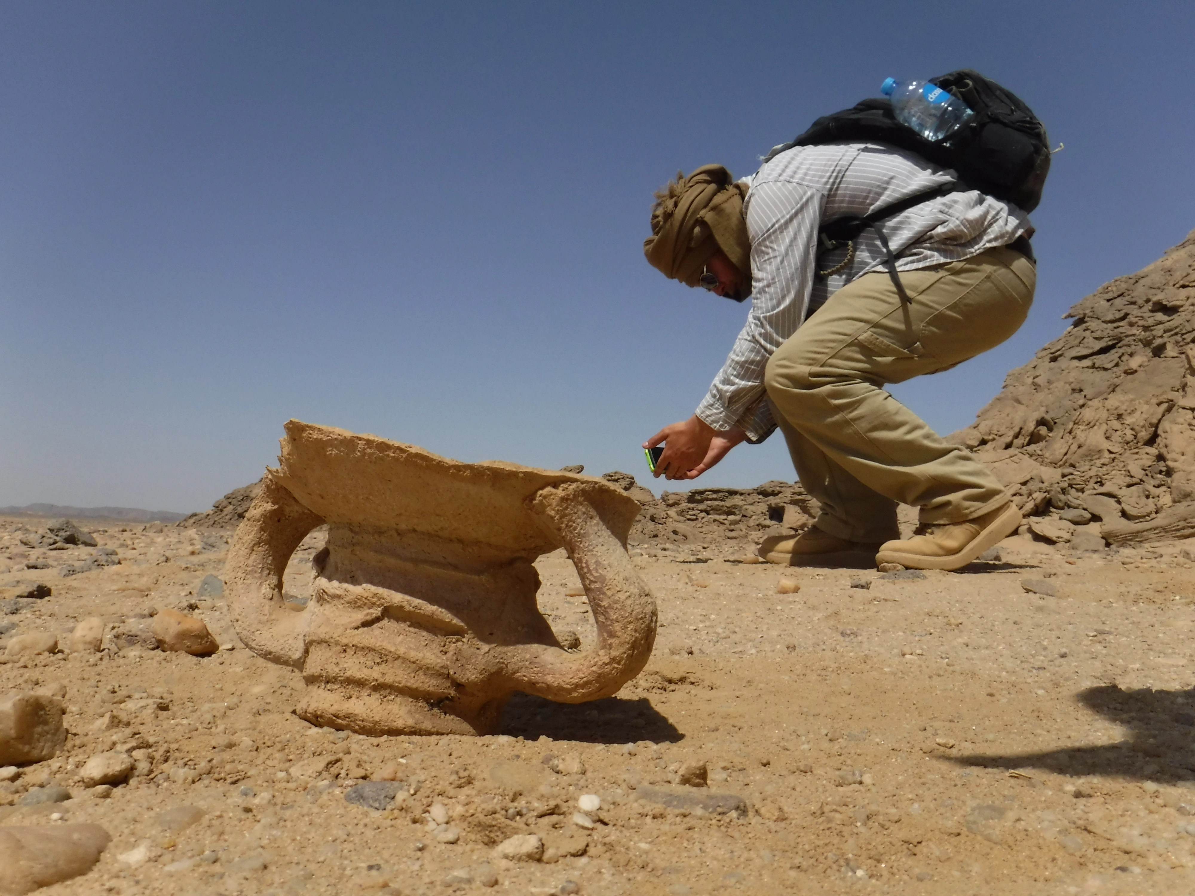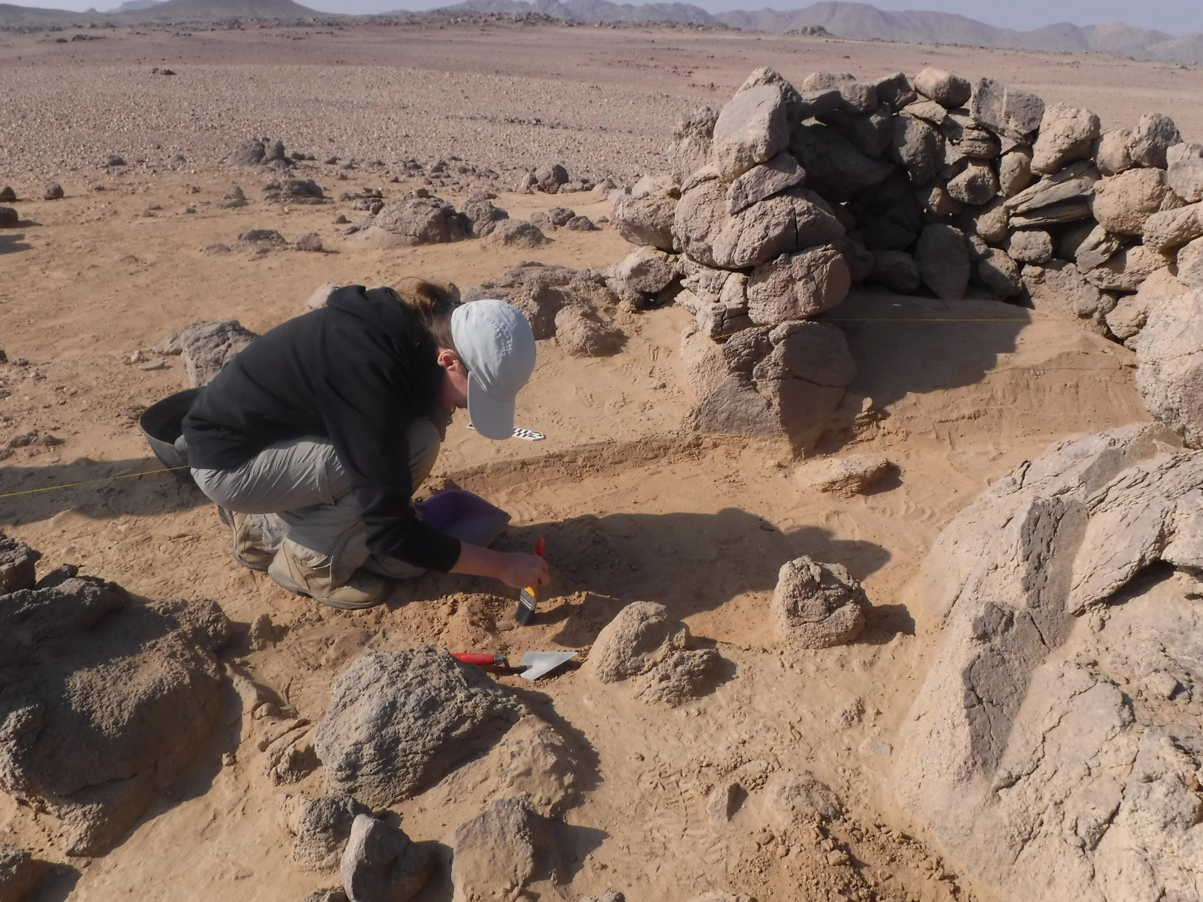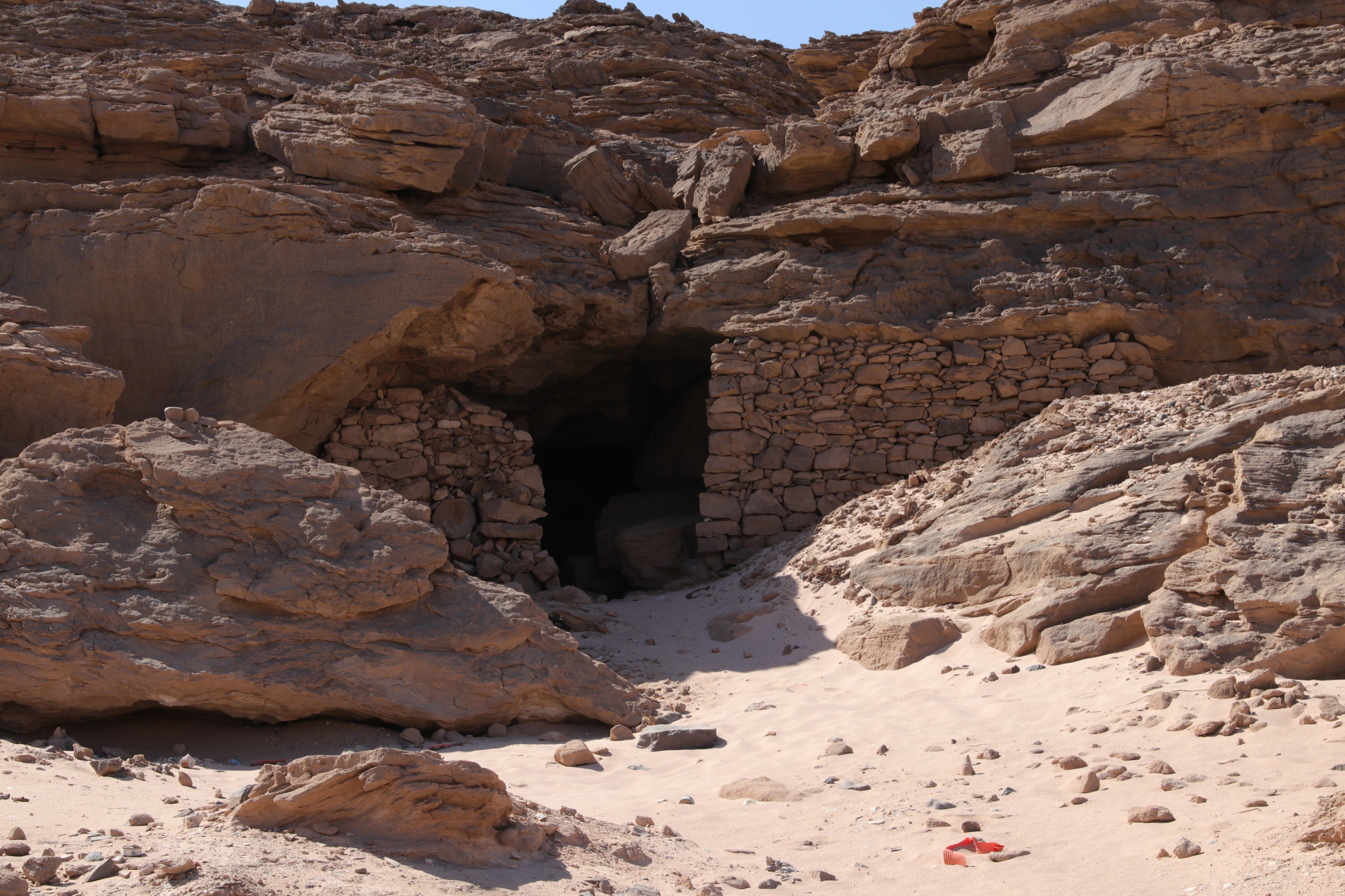 كان فريق أحمد فخري أول من قام بتحديد الموقع 8 في عام 1952 [i]، ثم قام كلٌ من إيان شو وروبرت جيمسون بزيارة الموقع مرة أخرى لفترة قصيرة في عام 1992 [ii]. هذا الموقع هو الأقرب إلى أسوان ويقع على سهل رملي بين تلال جرانيتية. عرّف فخري الموقع 8 في الأصل باعتباره موقعًا لبئر على الأرجح، ولكن بعد دراسة السطح وإجراء أعمال التنقيب في الموقع، فإننا نختلف مع هذا التعريف. حُفرت في العصور القديمة ثلاث حفرات متوسطة الحجم في هذه المنطقة، نعتقد أنها كانت لمحاجر وليس لآبار. تُشكّل المخلفات الناتجة عن هذه الحفرات تلًا كبيرًا في وسط الموقع، شُيدت بعد ذلك حوالي 10 أكواخ كبيرة على جوانب هذا التل. يضم الموقع آثارًا من عصر الدولة الوسطى والعصر البطلمي والعصر الروماني، بما في ذلك لوحة بقمة مستديرة وقاعدة خالية من النقوش من عصر الدولة الوسطى. حُفر خندق اختبار أولي للتنقيب في واحدة من هذه الحفرات في عام 2021. كشف هذا عن مستويات أفقية ضيقة جدًا من الرمال ناتجة عن سقوط الأمطار لآلاف السنين. ووفقًا لرأي الجيولوجي د. محمد حمدان من جامعة القاهرة [iii]، لم تكن هذه الحفرة بئرًا في يوم من الأيام وذلك نظرًا لاستواء التصدعات الأفقية؛ ولو كانت بئرًا، فإن تحرك المياه في القاع كان سيُحدث تموجات في هذه المستويات. بالإضافة إلى ذلك عثرت البعثة على قطع من حجر الكوارتز الحليبي. كما لم توجد أدلة تدعم وجود بئر هنا؛ فلا يوجد سلم أو مقابض للوصول إلى قاع البئر ولا يوجد أثر لأواني مياه مكسورة. وهكذا يستمر سعينا للعثور على أي مصادر قديمة للمياه في وادي الهودي، ولكن حتى الآن فإن الرأي الأكثر ترجيحًا هو أن قوافل الإمدادات المتواصلة كانت ضرورية لجلب الطعام والمياه من وادي النيل إلى بعثات التعدين هنا.