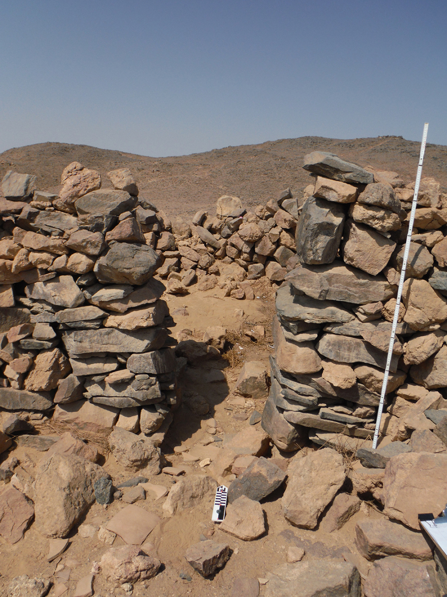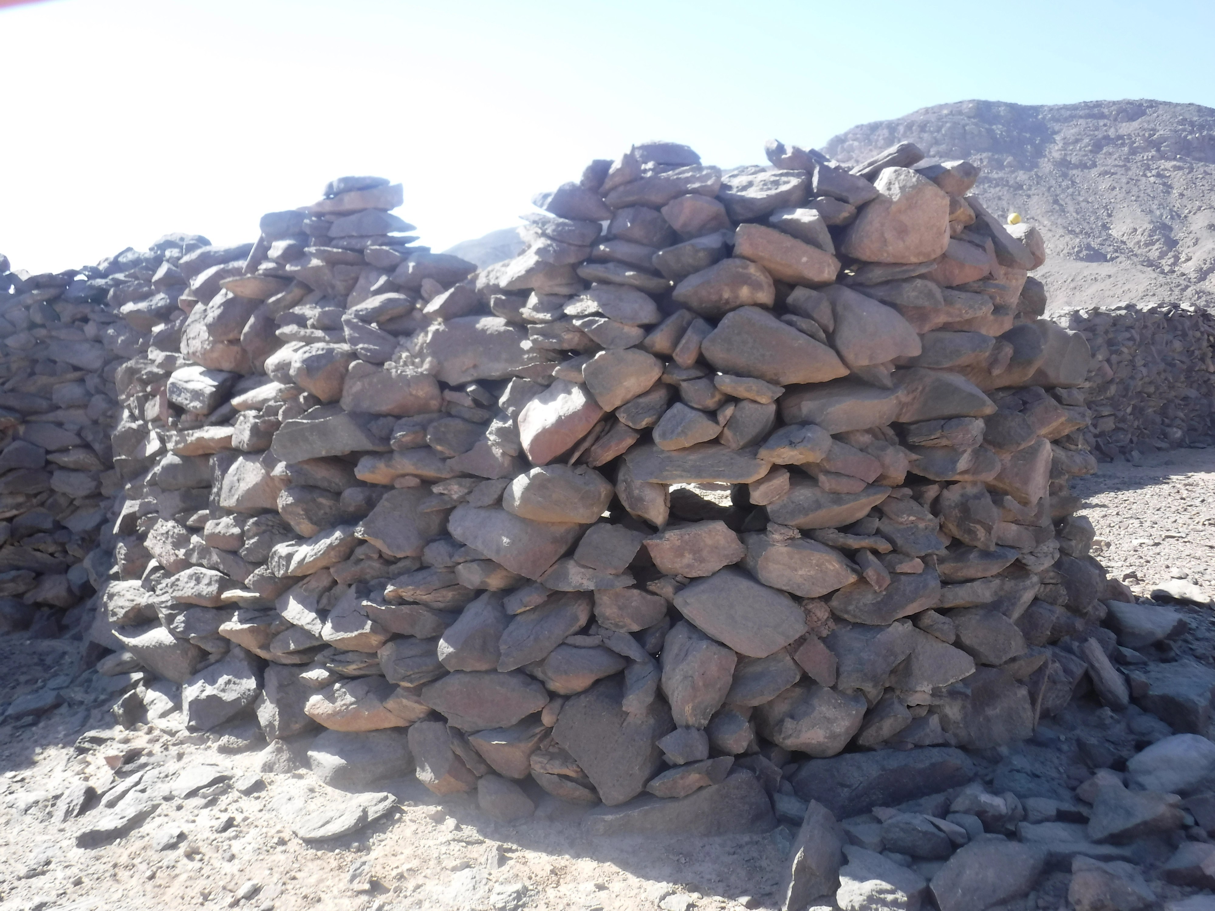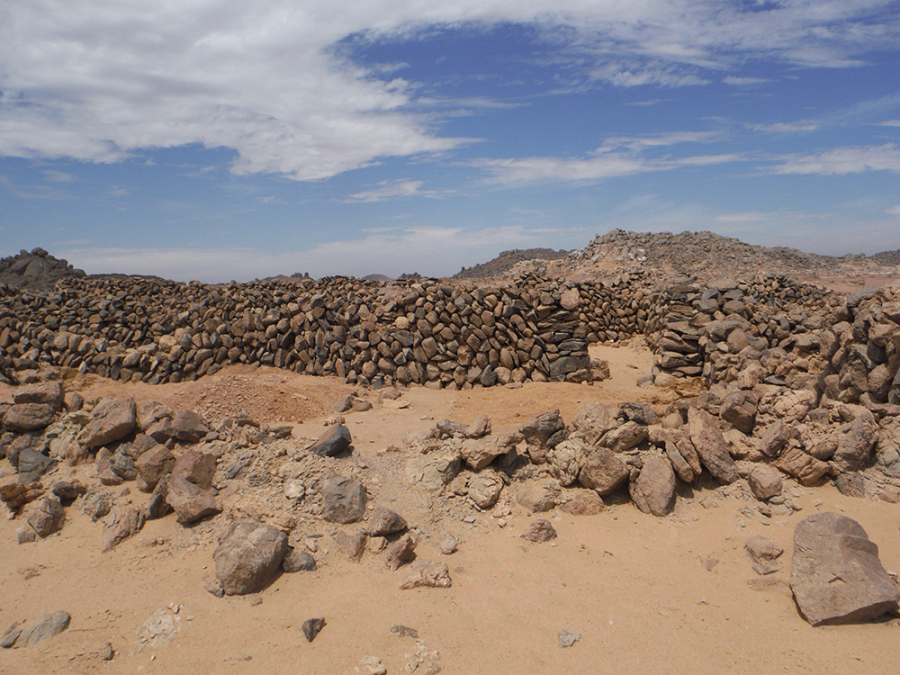 على قمة التل الشمالي الذي يطل على جنوب دهميت توجد قمة تل مزدوجة على شكل سرج حيث تم إنشاء حوالي 30 ركامًا من الأحجار وفناء لركام الأحجار وست صخور قائمة. كما عثرت البعثة هنا على ثلاث لوحات لمسؤولين. كما توجد أعداد كثيرة جدًا من ركام الأحجار، مما يشير إلى أن هذه المنطقة قد شُيدت لأغراض أخرى وليس لأغراض الملاحة والمراقبة فحسب. وبمقارنة هذا الموقع بالمواقع السكنية الأخرى من عصر الدولة الوسطى المرتبطة بأنشطة التعدين مثل موقع ستيلا ريدج بجبل العصر[iii]، من الممكن استنتاج أن هذا التل المغطى بركام الأحجار ربما تم إنشاؤه لممارسة شعائر دينية. بالإضافة إلى هذا يمكن مشاهدة مسارات وأكواخ وركام الأحجار وظواهر أثرية أخرى في كل الأنحاء. تُظهر المعالم المتنوعة التي تمكننا من ملاحظتها شخصيًا أو عن بعد أن موقع جنوب دهميت كان على الأرجح مركزًا لشبكة واسعة من مواقع التعدين في عصر الدولة الوسطى.