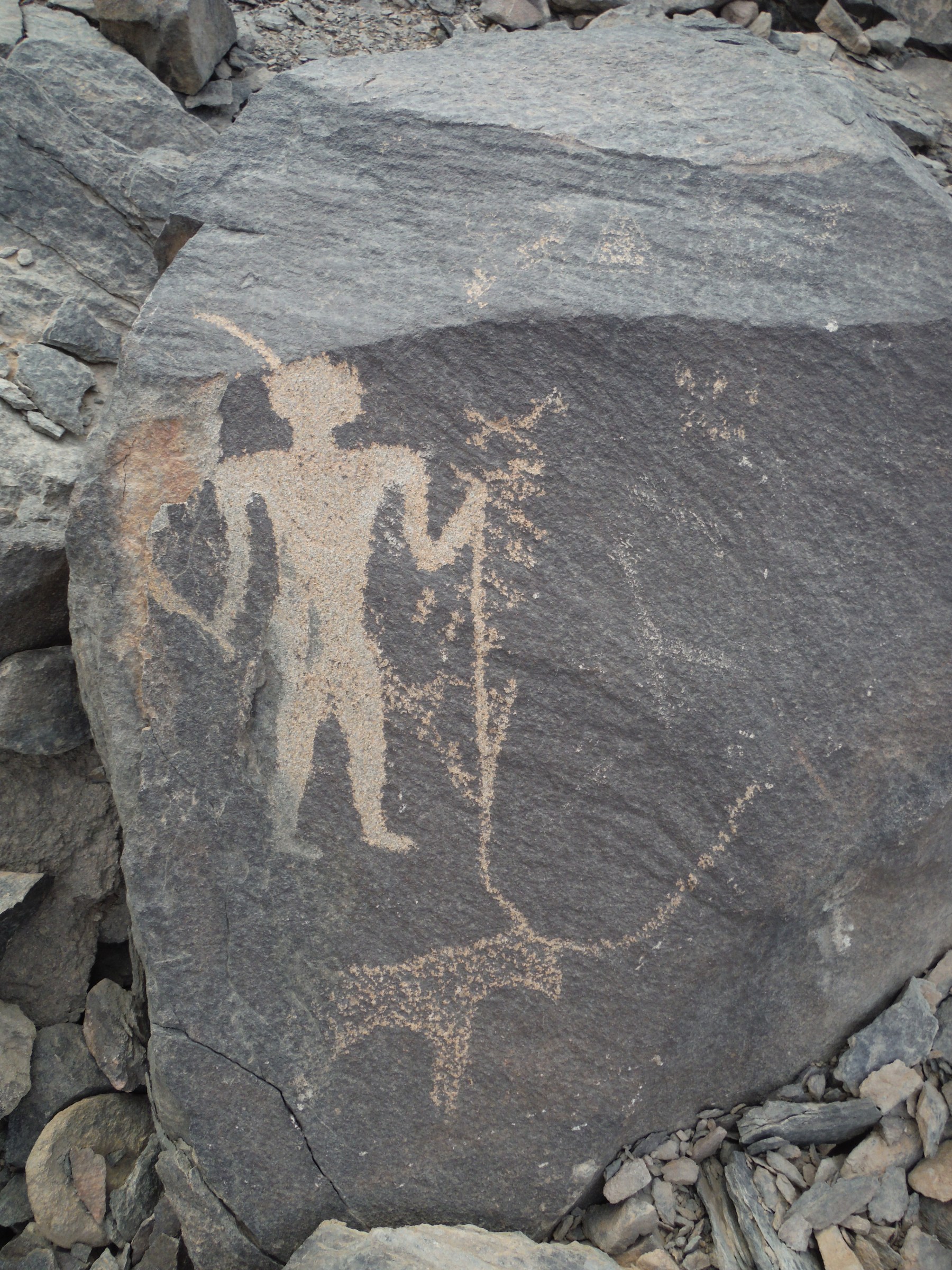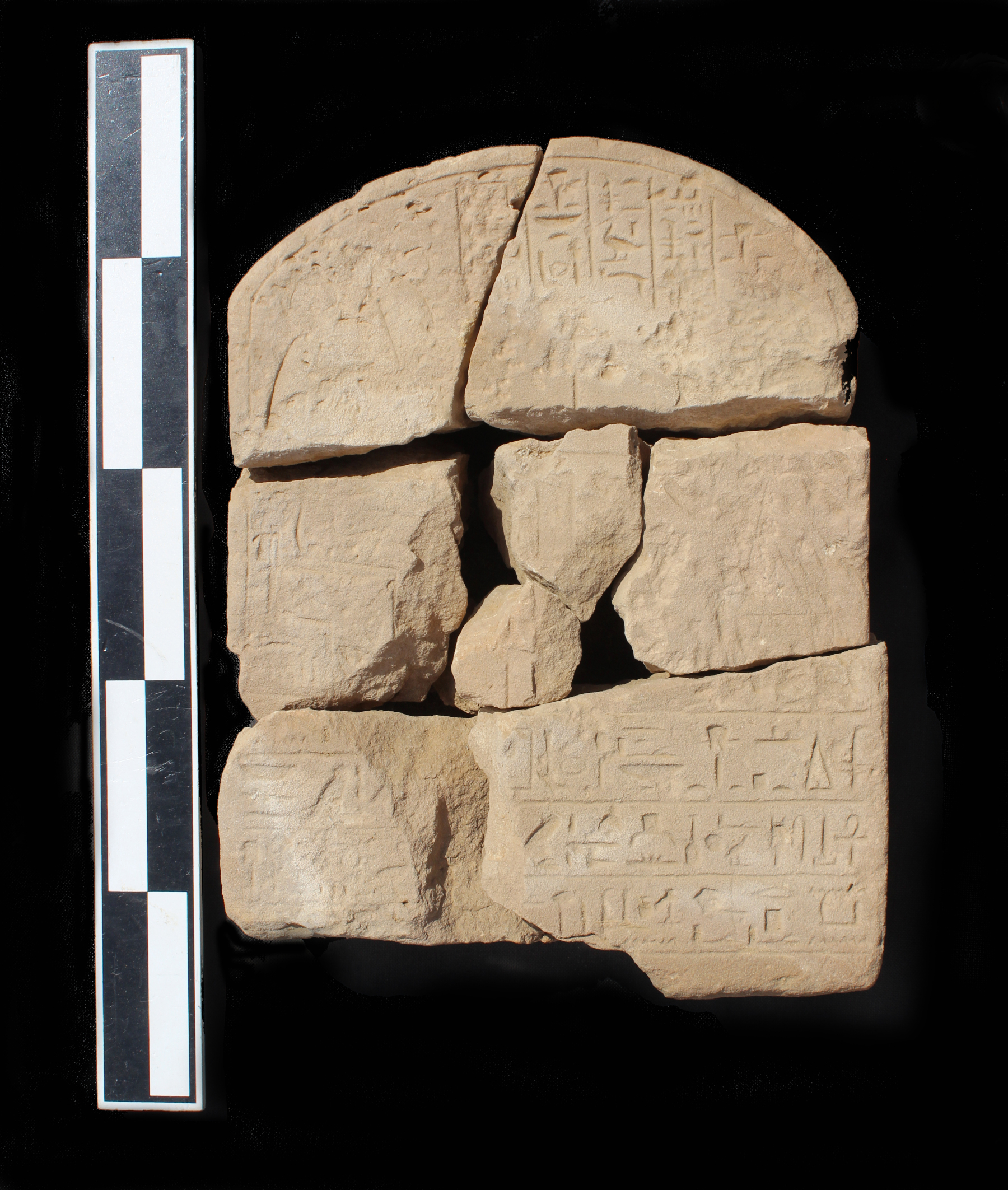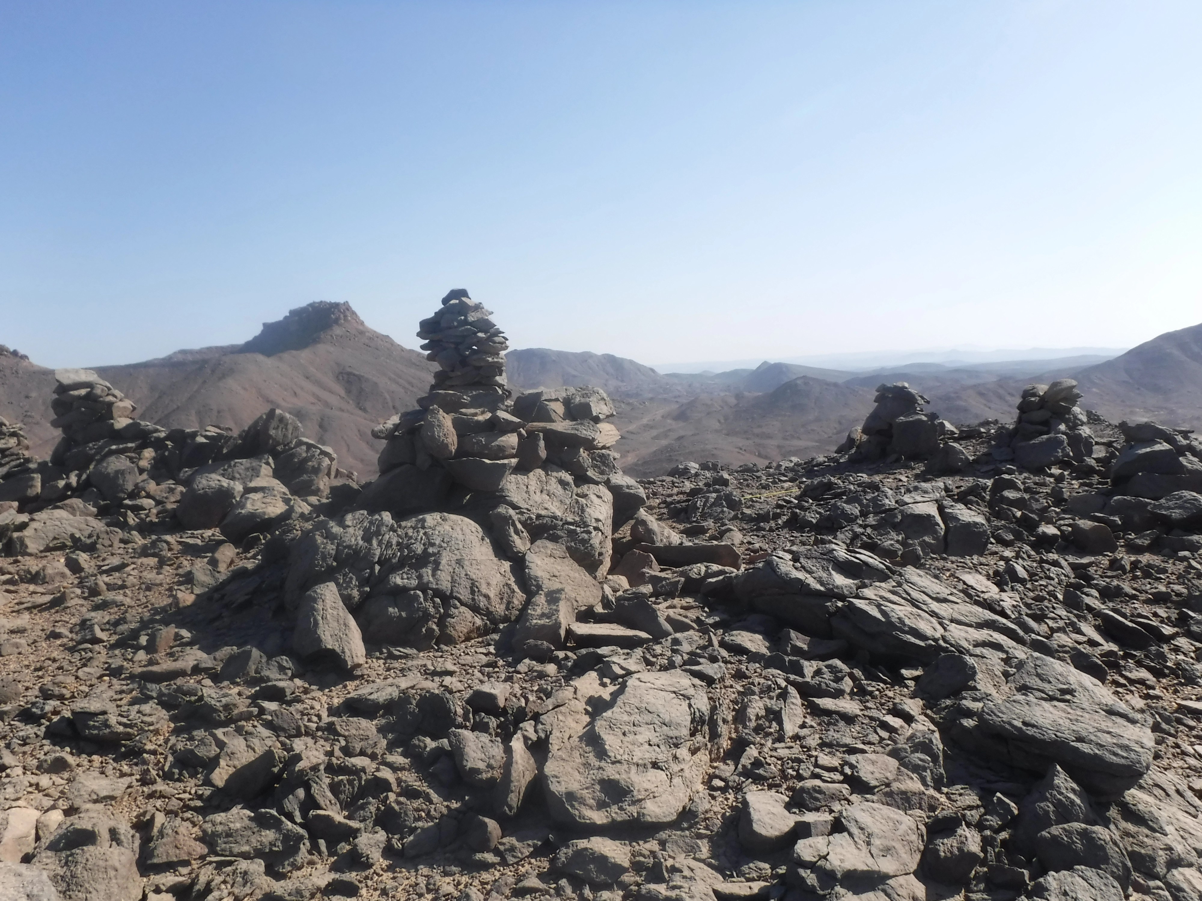 على قمة التل الشمالي الذي يطل على جنوب دهميت توجد قمة تل مزدوجة على شكل سرج حيث تم إنشاء حوالي 30 ركامًا من الأحجار وفناء لركام الأحجار وست صخور قائمة. كما عثرت البعثة هنا على ثلاث لوحات لمسؤولين. كما توجد أعداد كثيرة جدًا من ركام الأحجار، مما يشير إلى أن هذه المنطقة قد شُيدت لأغراض أخرى وليس لأغراض الملاحة والمراقبة فحسب. وبمقارنة هذا الموقع بالمواقع السكنية الأخرى من عصر الدولة الوسطى المرتبطة بأنشطة التعدين مثل موقع ستيلا ريدج بجبل العصر[iii]، من الممكن استنتاج أن هذا التل المغطى بركام الأحجار ربما تم إنشاؤه لممارسة شعائر دينية. بالإضافة إلى هذا يمكن مشاهدة مسارات وأكواخ وركام الأحجار وظواهر أثرية أخرى في كل الأنحاء. تُظهر المعالم المتنوعة التي تمكننا من ملاحظتها شخصيًا أو عن بعد أن موقع جنوب دهميت كان على الأرجح مركزًا لشبكة واسعة من مواقع التعدين في عصر الدولة الوسطى.