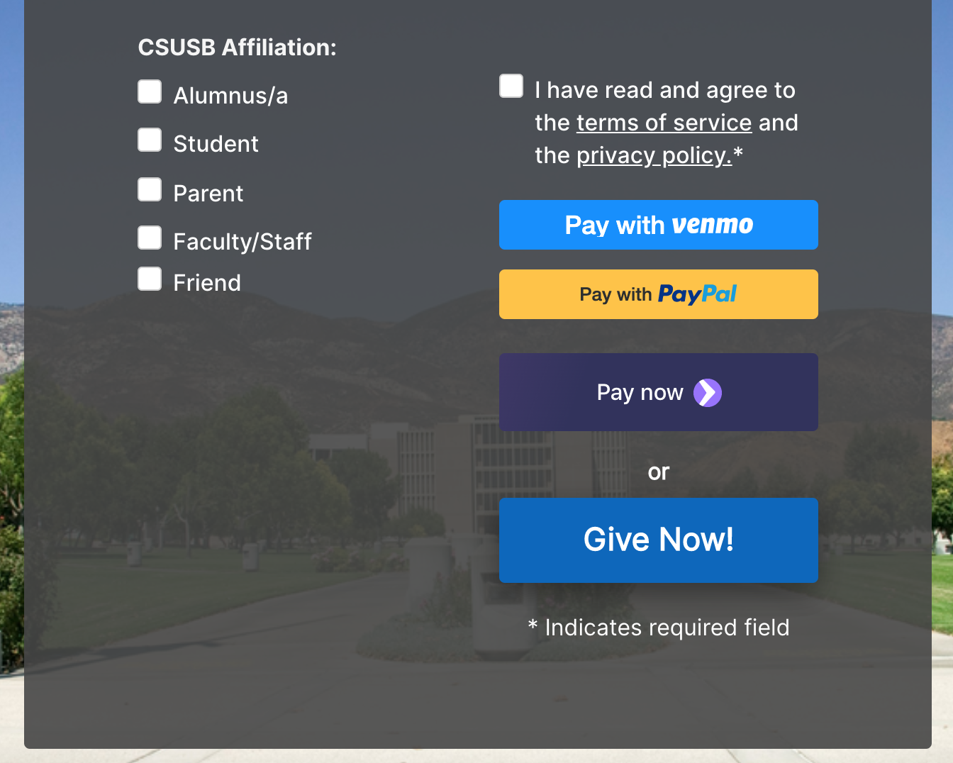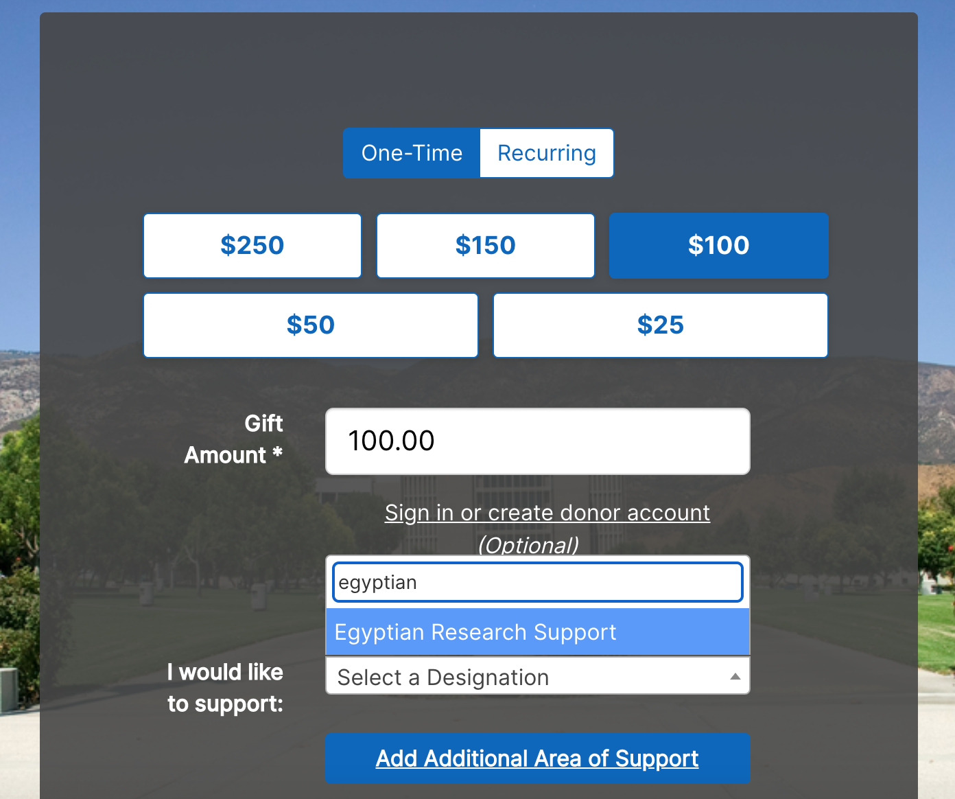 يمكنكم تقديم الهدايا غبر الأنترنت وهو أمر في غاية الأمان وتتم التحويلات على الفور دون انتظار وقت محدد. تقبل مؤسسة CSUSB الخيرية بطاقات الائتمان والفيزا كارت، والماستر كارت وكذلك كارت أمريكان إكسبرس لتقديم الهدايا باستخدام بطاقات الائتمان يرجي تحديد واختيار الرابط “تبرع اليوم عبر الإنترنت الموجود أدناه”. من فضلك تحديد “Egyptian Research Support” . الصورة أدناه عن كيفية إعداد هديتك.